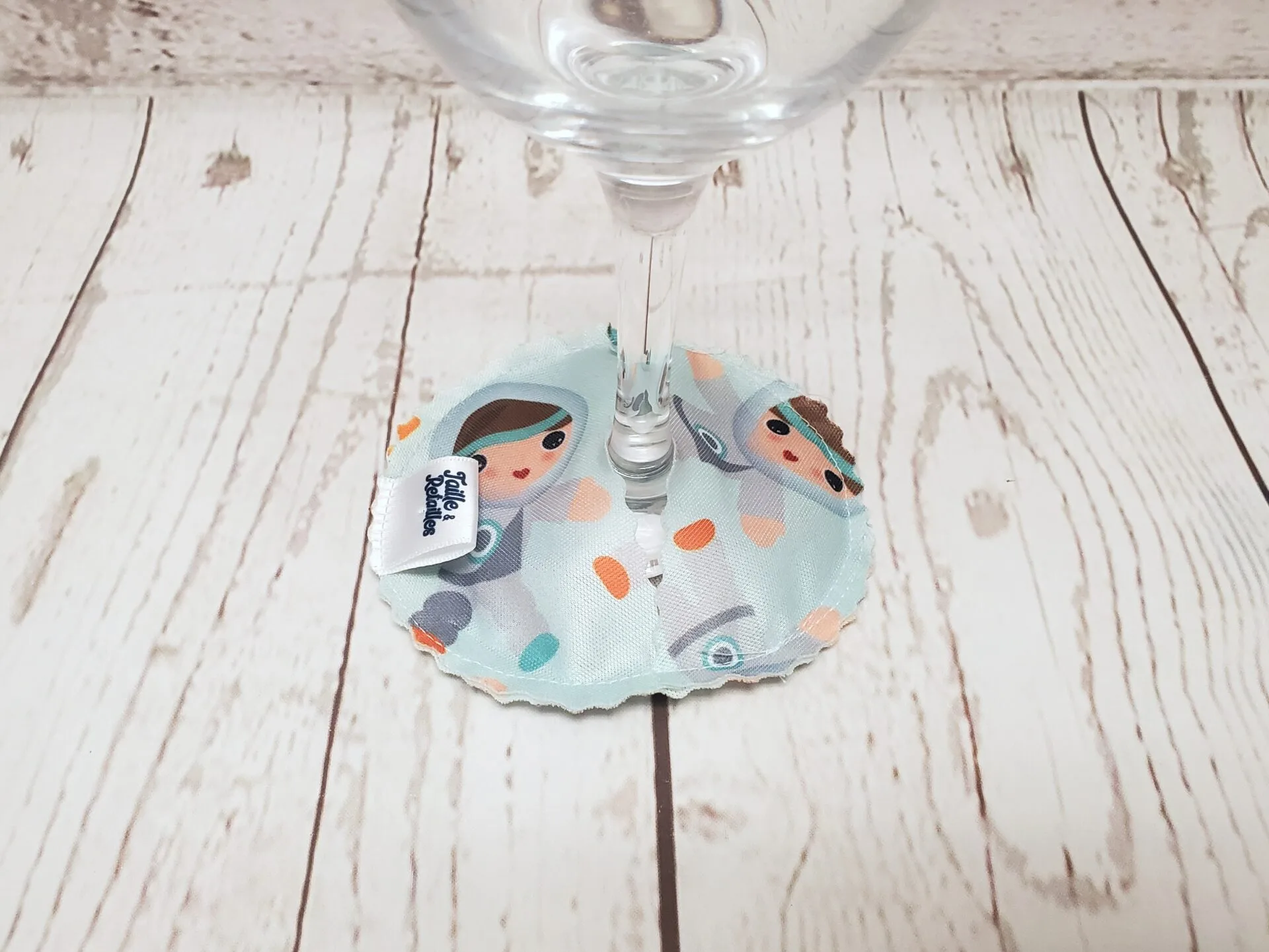 Les identifiants pour verres à vin Taille & Retailles se glissent autour du pied de la coupe pour que chacun reconnaisse la sienne en un clin d’œil. Ils servent en même temps de sous-verre qui suit la coupe de vin.