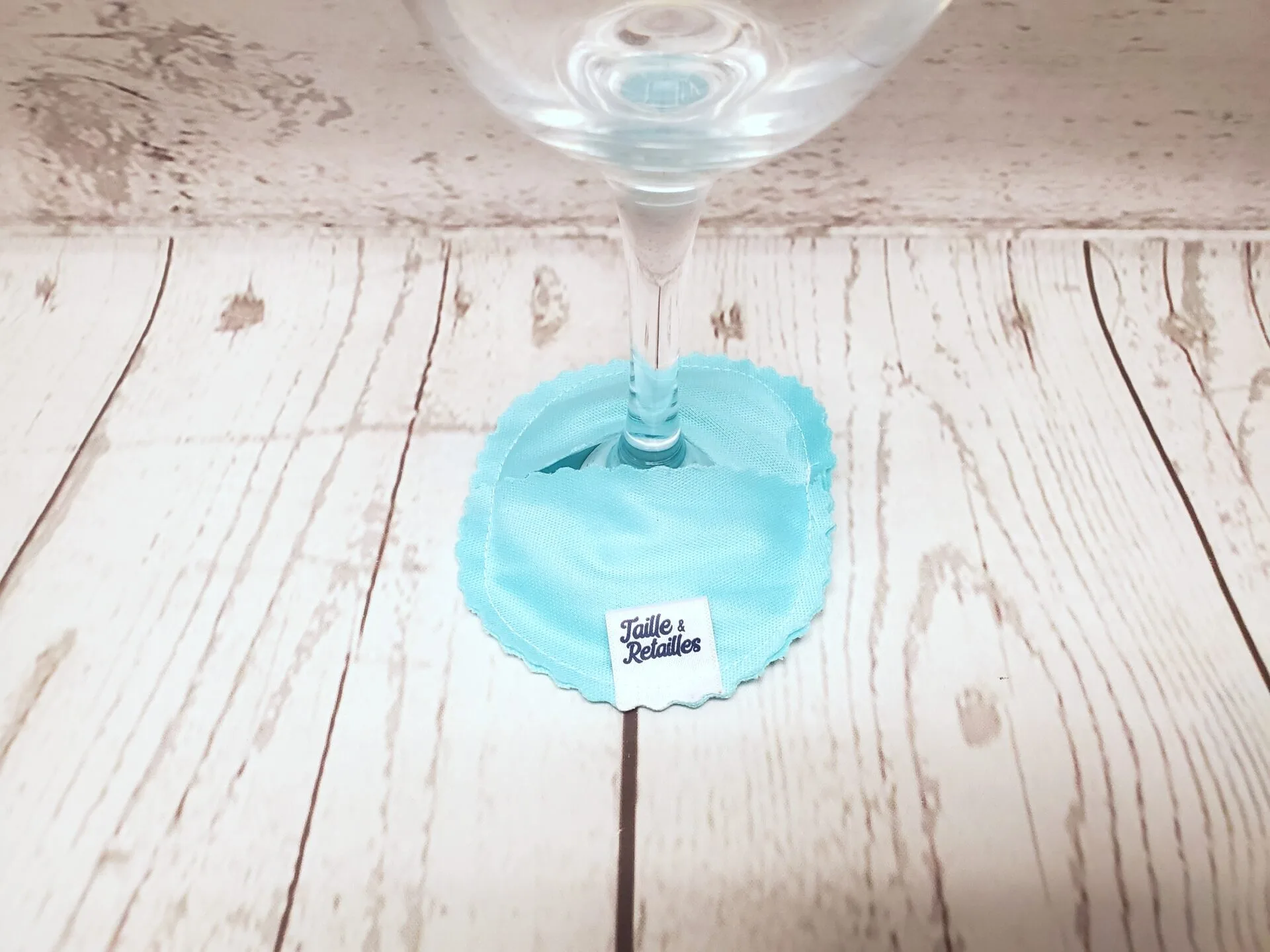 Les identifiants pour verres à vin Taille & Retailles se glissent autour du pied de la coupe pour que chacun reconnaisse la sienne en un clin d’œil. Ils servent en même temps de sous-verre qui suit la coupe de vin.