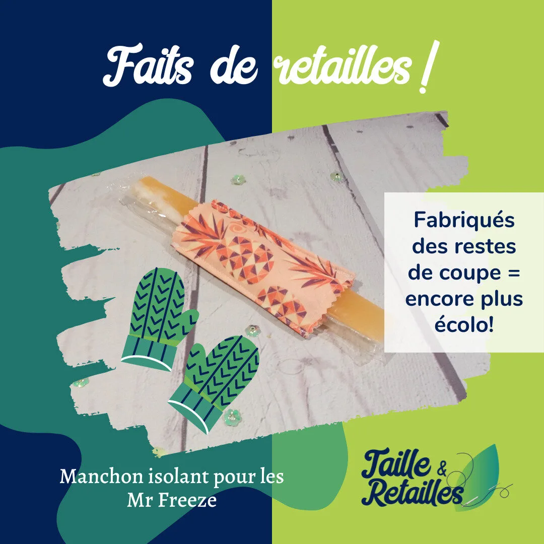 Ces manchons réutilisables remplacent les essuie-tout et emballages jetables. Chaque couvre « Mr Freeze » est fabriqué à partir de restes de tissus imperméables provenant de la production de couvre-bols et sacs Taille & Retailles, réduisant ainsi les déchets textiles et donnant une seconde vie à ces matériaux. ♻️