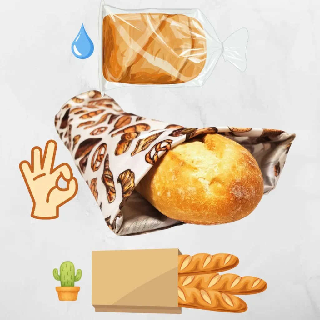 Le sac de plastique jetable, lui, fait bien pour la conservation. Mais si le pain est encore chaud lorsqu’il y est placé, ou si on le dégèle dans ce sac, il a tendance à moisir plus rapidement. 🙅
